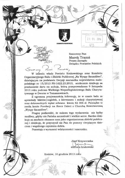 Władze Powiatu Krakowskiego i Komitet Organizacyjny Balu i Zbiórki Publicznej "Na Wyspy Szczęśliwe" podziękowały za dar serca przekazany przez Marka Tramś na rzecz aukcji charytatywnej, mającej na celu zasilenie konta Fundacji na Rzecz Dzieci z Chorobą Nowotworową "Wyspy Szczęśliwe".